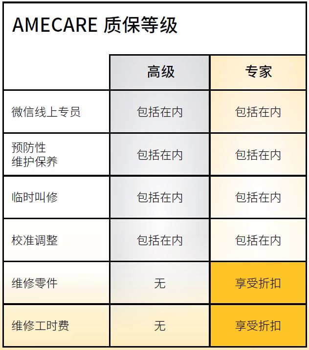 AMECARE 计划每年收取一个固定费用,具体取决于使用情况和您选择的 AMECARE 计划的质保等级。